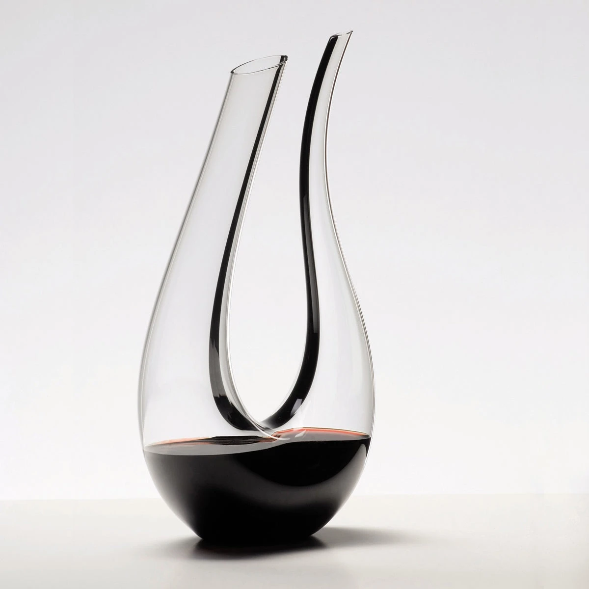 The Amadeo Black Tie Decanter shares the same graceful lyre form as the other decanters in the line, but adds a distinctive difference. Its flawless clear crystal body is articulated with a single slender black tuxedo stripe that lovingly follows the contours of its stylized U-shaped silhouette. A prime example of streamlined chic, this new decanter is a marvelous companion to Riedel’s Sommeliers Black Tie glasses, with their black stems and clear bases for red wine and clear stems and black bases for white. – 4100/83 – 1 – C44