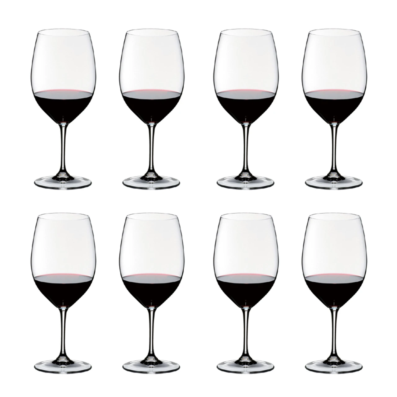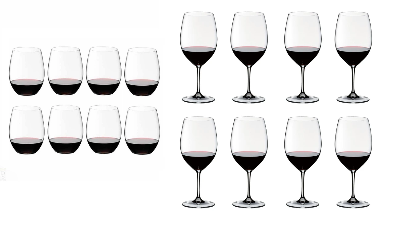 Set Includes: (8) Vinum Cabernet/Merlot Wine Glasses and (8) “O” Series Stemless Cabernet/Merlot Wine Glasses