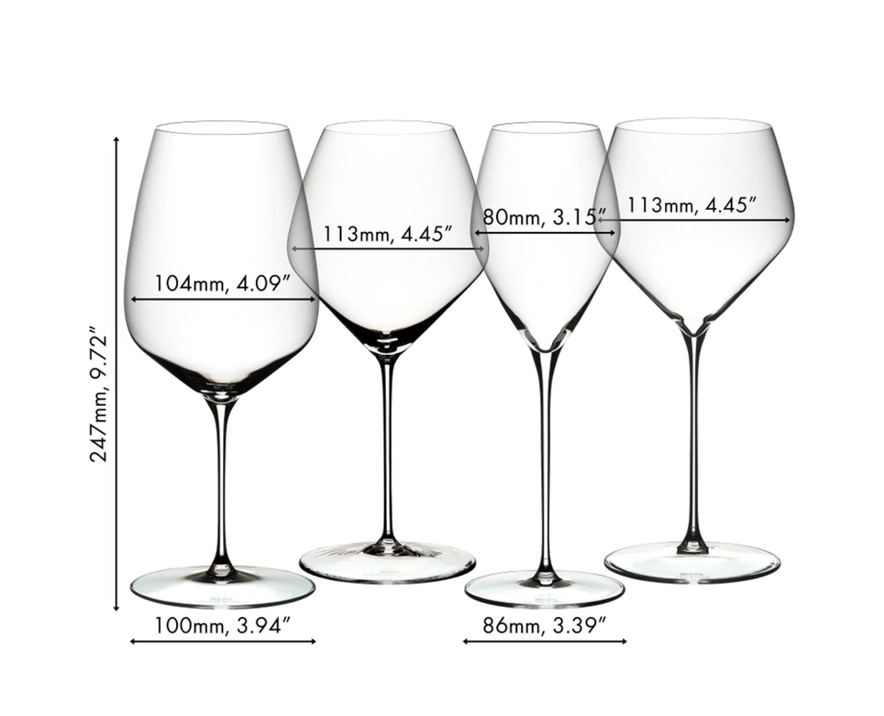 This set contains from the RIEDEL Veloce collection: one Cabernet, one Pinot Noir, one Sauvignon Blanc and one Chardonnay glass.
